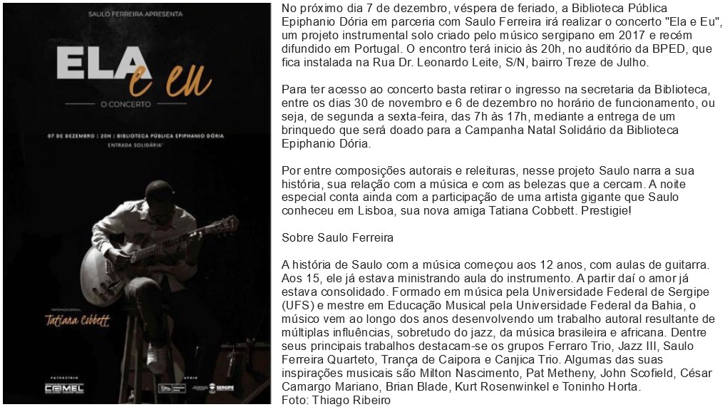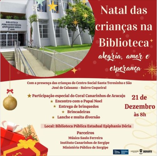 Natal é tempo de fortalecermos os laços de amor, solidariedade e esperança, de renascermos no que há de melhor em cada um de nós, como oferta genuína de humanidade. Nesse espírito natalino, a Biblioteca Pública Estadual Epiphanio Dória realiza o Natal das Crianças na Biblioteca. Com a presença das crianças do Centro Social Santa Teresinha e São José de Calasanz, a programação está repleta de alegria e solidariedade. Confira: Local: Biblioteca Pública Estadual Epiphanio Dória Data: 21 de dezembro de 2022 Horário: 8h Parceiros nesse projeto: Músico Saulo Ferreira, Instituto Canarinhos de Sergipe e Ministério Público de Sergipe.